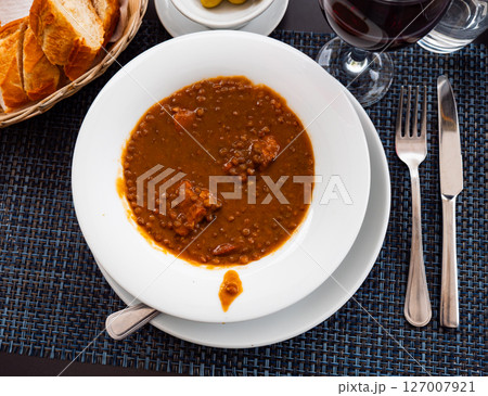 Spicy stewed lentils with suasage and vegetables with thick tomato sauce served in white plate. Spanish cuisine