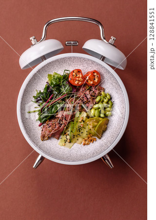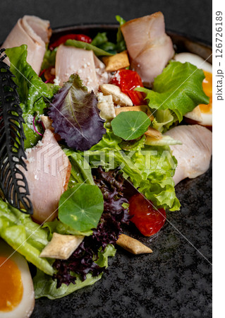 Salad with chicken, tomatoes and eggs with seeds and grains. Concept time to eat dinner