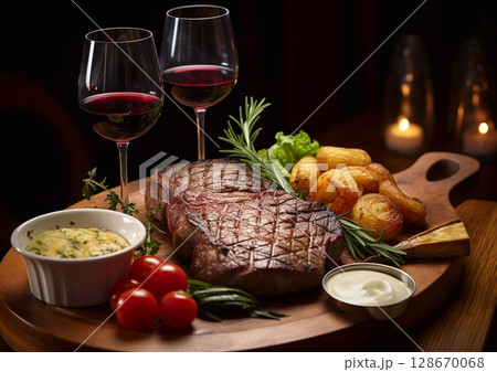 Ribeye beef steak with tomatoes and potatoes with glasses of red wine on wooden table.AI Generative.