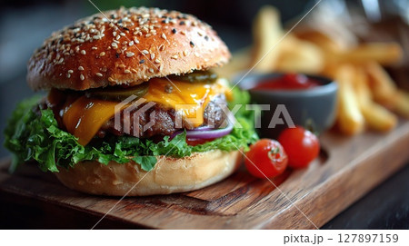 A mouthwatering cheeseburger with all the fixings, french fries, and ketchup.