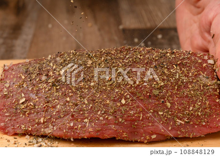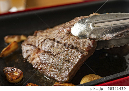 塩胡椒した牛ステーキ肉を鉄板で焼く