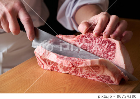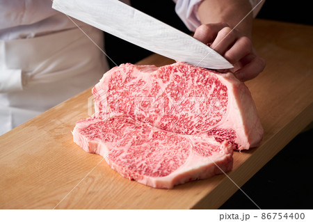 サーロインステーキを包丁でカットする料理人 国産黒毛和牛
