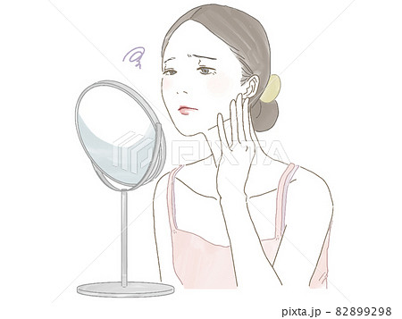 鏡を見ながらほうれい線に手をあてて気にする女性