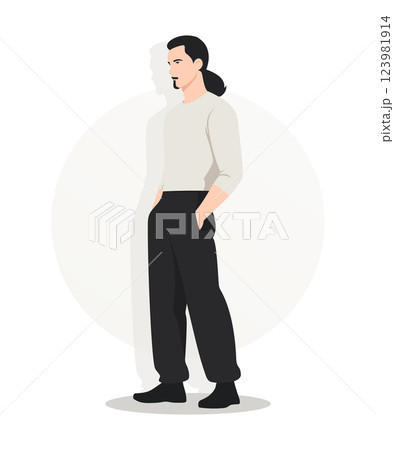 Young Man with Long Hair in a White T-Shirt and Black Pants Standing Casually