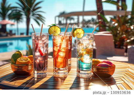 Glass of pineapple juice with ice and citrus garnish in tropical setting