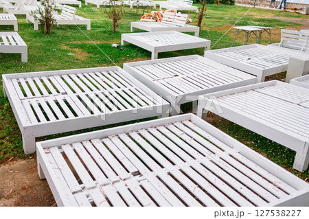 Close-up White beach beds arranged on green grass. Coastal relaxation, vacation ambiance and summer leisure by the sea.