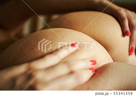 Closeup on beautiful buttocks of young naked woman with woman's hand