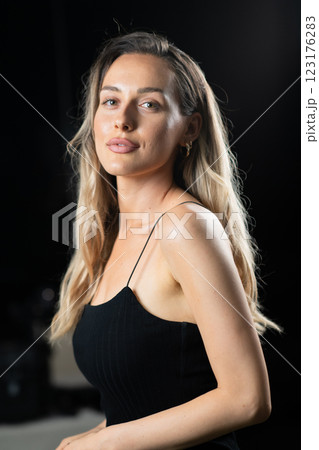 Radiant Elegance: A Stunning Blonde in a Black Dress Exuding Confidence and Beauty.