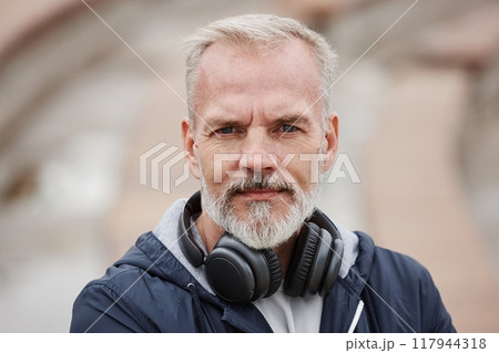 Close up of smiling senior white haired man with headphones looking at camera during