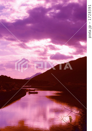 紫色に輝く大隈半島、肝属川の朝