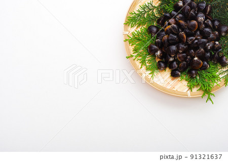 竹ざるに盛った新鮮なシジミ