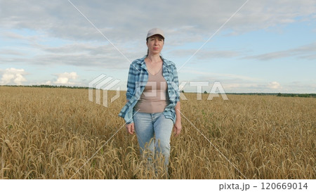 Female Farmer Examining golden Wheat Field Before Harvesting Crops. Portrait Of Pretty Caucasian Woman In golden Field. Moves slowly.