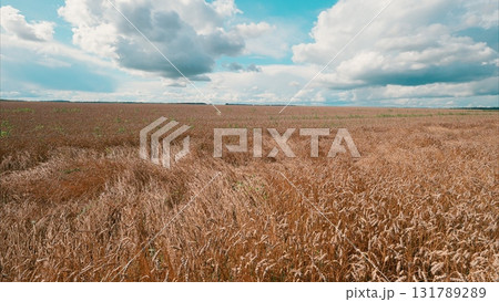 Vast and Expansive Wheat Field Spreading Under a Beautiful Blue Sky with Fluffy White Clouds