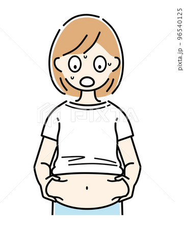 お腹が脂肪でぽっこり太ってしまって、ため息をついてる女性のイラスト。
