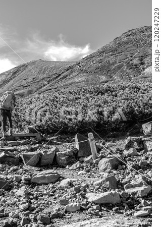 長野県の乗鞍岳の観光登山 剣ヶ峰を登る登山者