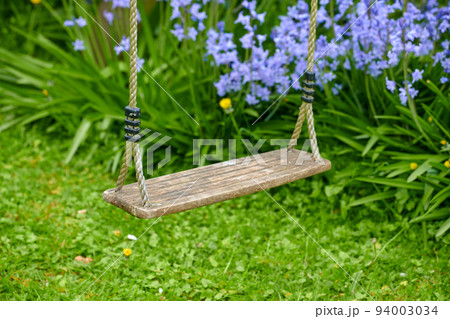 Old wooden swing in a garden with blue flowers and moss growing in backyard. Peaceful scene of a forgotten playground with lush greenery and wild bluebells on overgrown lawn in spring with copy space