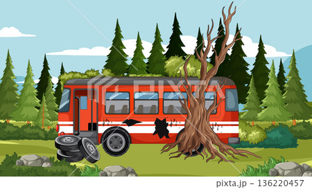 Abandoned Red Bus Crashed Into Tree In Forest