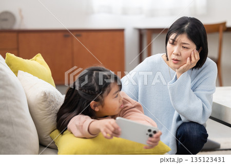 スマートフォンに夢中な娘を心配そうに見つめる母親