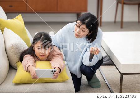 ソファでスマートフォンを操作しながら母親を睨む小学生の女の子
