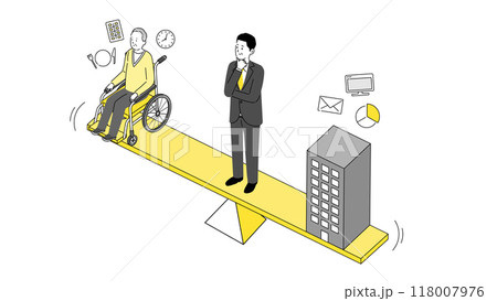 介護と仕事の両立イメージのイラスト、天秤に立つ男性ビジネスマン、ベクター