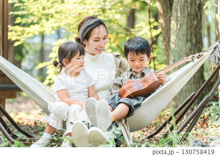 キャンプ場のハンモックで遊ぶ家族・ファミリー(アウトドア・旅行・レジャー・ピクニック)