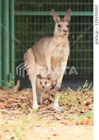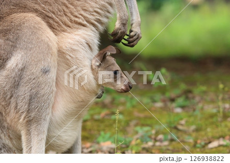 カンガルーの親子 お腹の袋から顔を出す赤ちゃんカンガルー