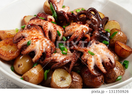 baby grilled octopus with golden baked potatoes and fresh herbs, Maltese cuisine, homemade, no people,