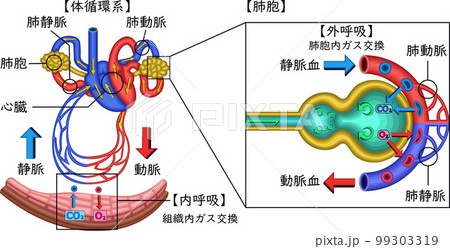 体循環系 ガス交換 肺胞 イラスト 日本語