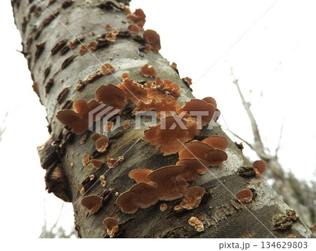 広葉樹の枯れ木などに生える「ウスバタケ」:下から見た状況
