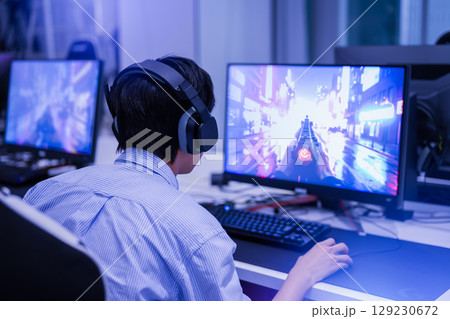 ゲーミングチェアでゲームに没頭する男子学生の後ろ姿
