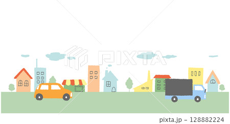パステルカラーの街並みと車のかわいい手描きイラスト