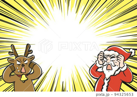 ショックを受けるサンタクロースとトナカイのイラスト 集中線背景あり