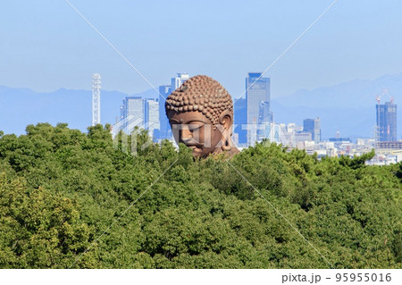 愛知県東海市 名古屋のビル群をバックにそびえ立つ聚楽園大仏