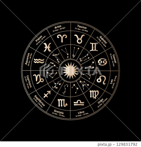 Elegant zodiac wheel with astrological signs, constellations, and dates on black background. Perfect for mystical, spiritual, or horoscope-themed designs. Vector