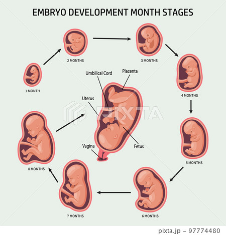 Embryo month stages of development vector illustration - pregnancy infographic.