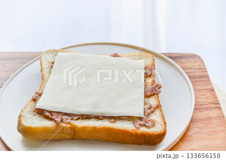 食パンに塗り敷いた合挽肉を焼く