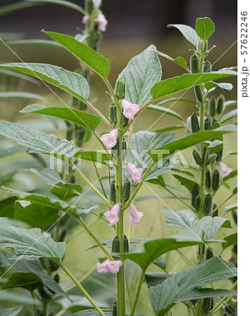 ピンクの花と実がついているゴマの畑