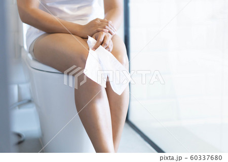 Close up woman stomachache with toilet