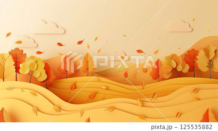 Autumn landscape with falling leaves in paper cut style. Background for seasonal design