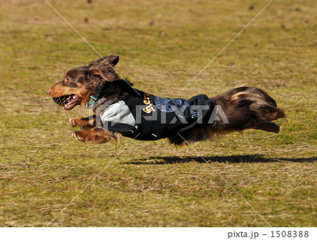 ドッグランで楽しそうに走るミニチュアダックスフンド