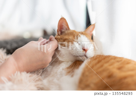 猫を撫でる 茶トラ白