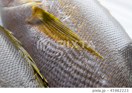 【白背景】獲れたて新鮮なピンク色が美しい活きのいい真鯛の背びれ