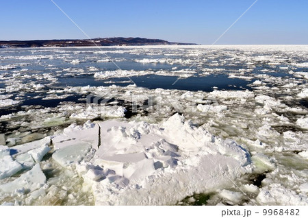 北海道・サロマ湖東部の海岸より押し寄せる流氷群と遠景に能取岬、知床方面を展望(北海道北見市常呂町東浜