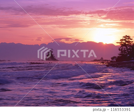 雨晴海岸より見る標高3,000m級の立山連峰から昇る初日の出/日本の渚百選/能登半島国定公園