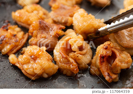 焼肉でホルモンのシマチョウを焼く