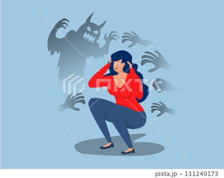 Woman scared of his own monster shadow. Mental health disorder, stress, impostor syndrome, and phobia.Anxiety, panic attack, and depression metaphor.vector