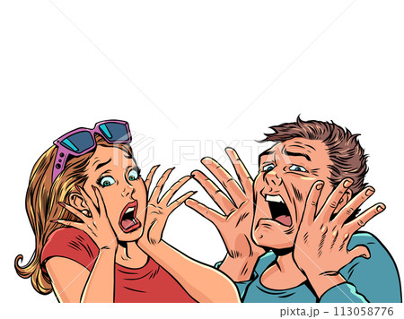 Pop Art Retro A man and a woman scream in horror, covering their faces with their hands. Scary honeymoon proposals. Surprised and frightened clients.