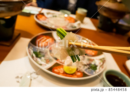 安岡葱を巻いたふぐ刺しを箸で見せる
