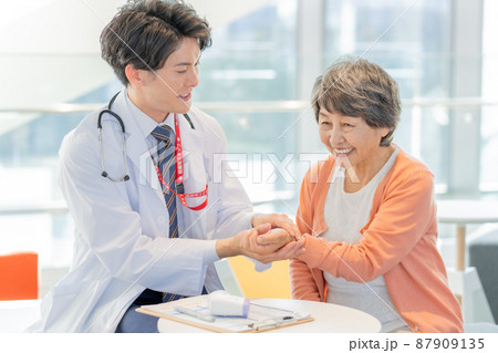 シニアの女性の脈を測る若い男性医師 撮影協力「LINK FOREST]