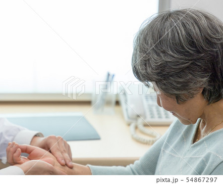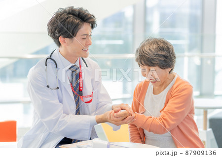 シニアの女性の脈を取る若い男性医師 撮影協力「LINK FOREST]